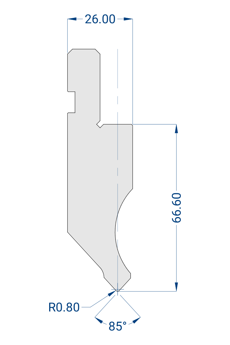 Short economical punch, European standard, universal, angle with 85°, radius 0,8 mm, working height 66,60 mm, made in C45 material, used up to 100 t/m force. Available and could be used as started set.